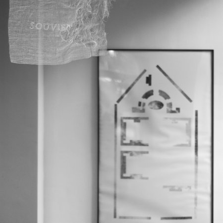 Un bout de tissu sur lequel a été brodé le fragment de mot « souvie... » est suspendu