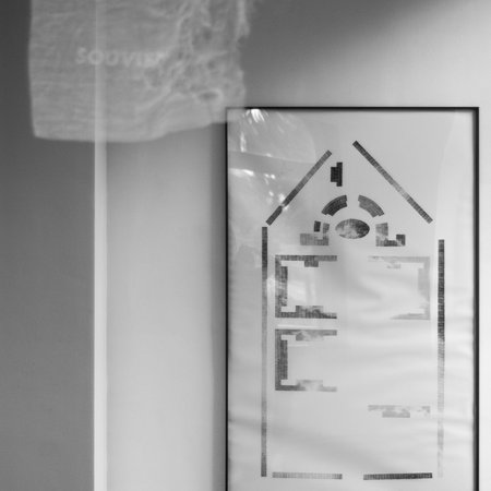 À droite, c’est le plan du cimetière militaire dans lequel est enterré le soldat. Il arbore curieusement la forme d’une maison. Jehanne Paternostre l’a dessiné à la manière d’un plan archéologique, une manière de souligner la fragilité de ce lieu érigé au nom de la collectivité qui menace de s’effriter avec le temps.