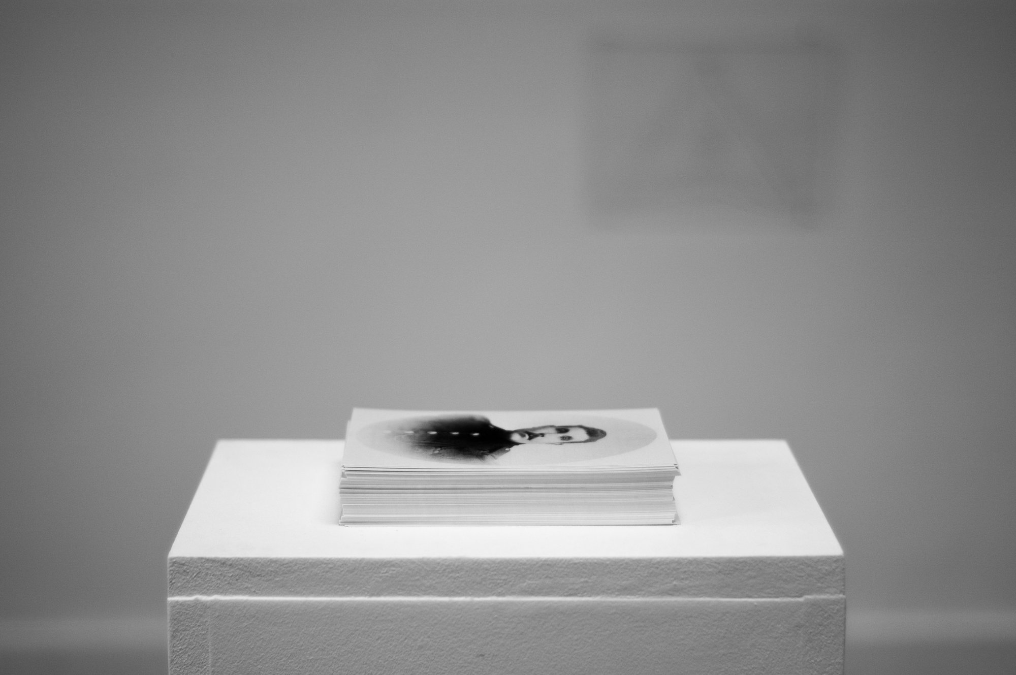 C’est probablement le premier élément par lequel le regard est attiré une fois passé la porte de l’espace d’exposition. Un petit tas de cartes sur lequel est imprimé le même portrait à l’infini. C’est un soldat en uniforme, le seul visage de l’exposition.