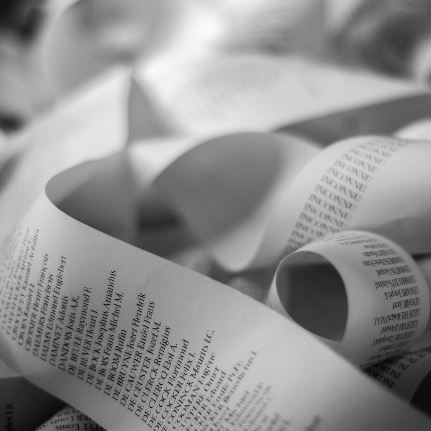 Dans la seconde salle d’exposition, l'artiste nous propose de découvrir un ticket de caisse, de septante mètres de long, sur lequel est imprimée la liste des soldats