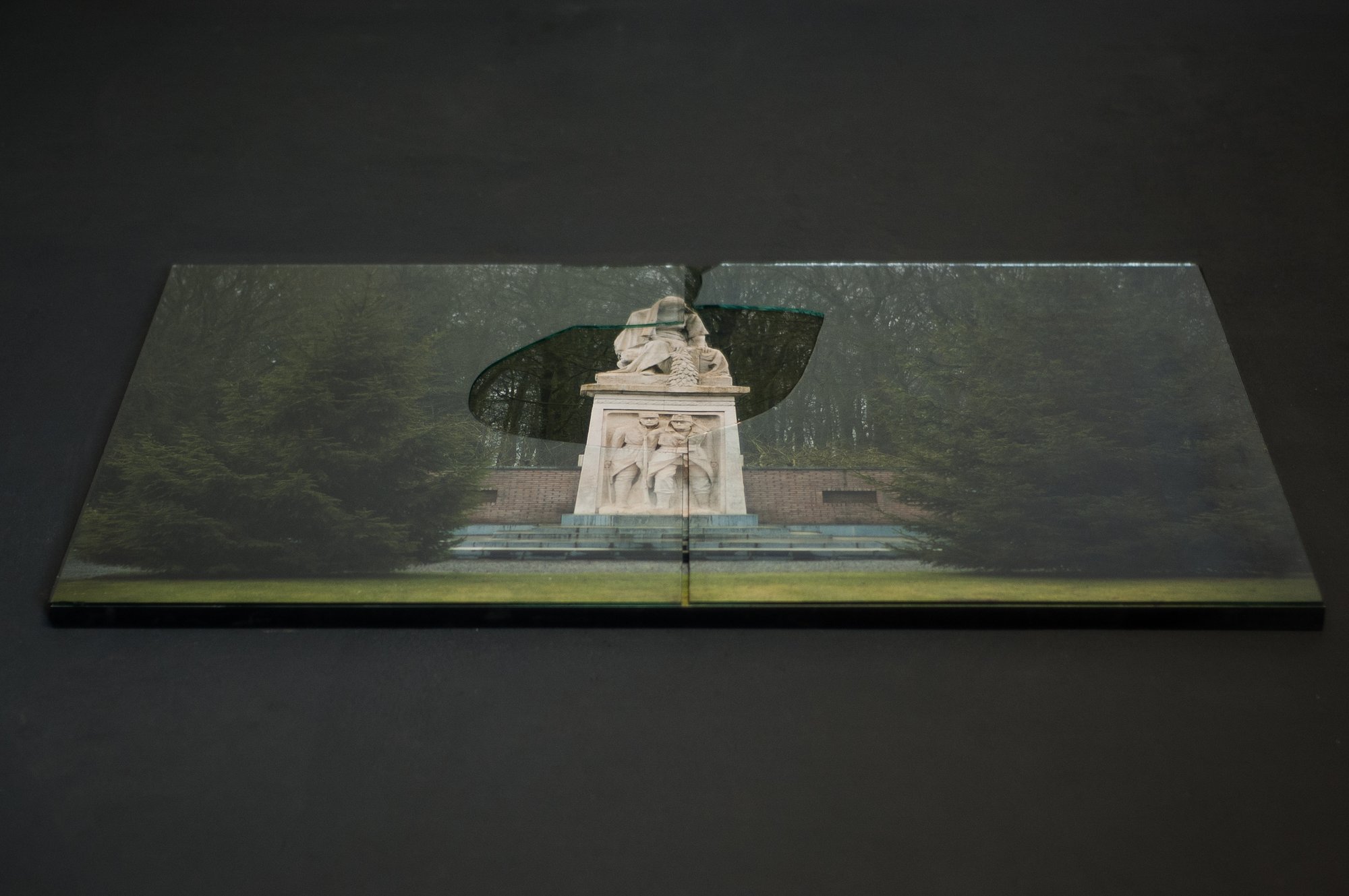 Une photographie sous verre du monument situé dans le cimetière militaire de Marchovelette est déposée à terre. La vitre a été cassée, créant un trou à hauteur de la sculpture en pierre, symbole d’éternité, sensée persister mais qui, irrémédiablement, finira par s’user comme nos souvenirs.