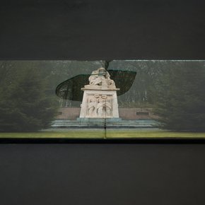 Dans la salle d'exposition, nous comprenons que le rapport a été inversé. La stèle de la mémoire collective s’incline face à la mémoire individuelle représentée par une photographie prise par l’artiste (image ci-dessous) exposée en grand sur le mur.