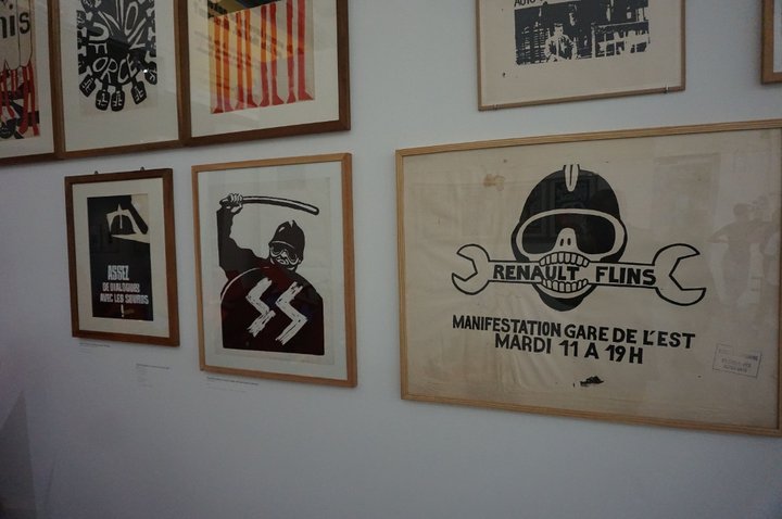 Il y a, à gauche, des regroupements, des alignements de gravures, de dessins et affiches qui retracent l’imaginaire contestataire de 68. Tel qu’il s’est exposé aux yeux de tous. Ce sont des vignettes pour la plupart hyper connues. Des classiques. On y accède à différents endroits, il y a des embûches, des détours. Ces images proviennent de groupes engagés, d’activistes, d’écoles, d’ateliers populaires, de rencontres entre ouvriers et artistes, d’anonymes, de célébrités. Elles racontent les luttes au plus près des réalités – telle manifestation précise avec son mot d’ordre, la mobilisation pour défendre une usine particulière (Flins), le répertoire des ennemis séculaires (racisme, extrême-droite, flics) –, et par la manière de montrer, dessiner, mettre en page, elles racontent aussi comment l’inscription dans ce réel s’accompagne d’une aspiration à déménager certains référents asphyxiants. Il y a, derrière ces productions qui mettaient l’art dans la rue, au service de la rue, des gestes d’artistes, évidemment, mais elles donnent l’impression d’être proches de la voix populaire, d’en capter quelque chose. Avec des cibles relativement simples. Sur l’immense mur, en face, se déploie une fresque réalisée in situ par Dan Perjovschi. Elle couvre la période de 1968 à 2018 sans être une ligne du temps, plutôt l’empreinte d’un temps éclaté en plusieurs couches, plusieurs réalités, l’avènement, l’installation progressive de la complexité. Pris séparément, les croquis, les mots, mettent en perspective des « problèmes », des cristallisations situationnelles, qu’il faudrait résoudre par plus de démocratie (débats, controverses, délibérations). L’ensemble est très dynamique et raconte des tas d’impasses de l’évolution selon des déplacements brefs, fulgurants, mais qui semblent insolubles. L’effet dynamique entre en conflit avec l’effet cul-de-sac. Ainsi de cette succession de gestes semblables, l’un balance un cocktail Molotov, l’autre, tout semblable, brandit un iPhone. Et l’ensemble, prolifique, croissant en tous sens, où l’on découvre sans cesse de nouvelles combinaisons, voilà les rouages de l’esprit mental de l’époque, complexes, sorte de machine infernale qui ronge la démocratie.