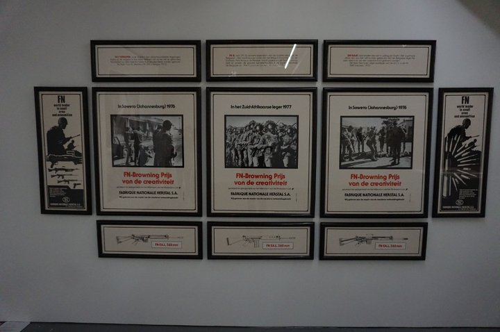 Une première tangente, peut-être, démarre avec Marcel Broodthaers, qui déstabilise l’art et le musée, en réduisant le patrimoine emblématique à quelques mentions génériques, désincarnées, à des impressions en matériaux pauvres, reproductibles sans limite, libérés de toute aura unique, ou en filmant le geste essentiel et dérisoire du projet décrire un texte : écrire consciencieusement sous la pluie, l’eau diluant l’encre sur le papier, faisant déborder l’encrier. Mais écrire quand même sans craindre l’invisible. Au contraire. Éloge de l’état de projet. Critique du monde de l’art, depuis l’intérieur, touché par l’écho de la révolution extérieure, mais n’en récoltant que des reflets, des conjonctions. Elle conduit, par proximité scénographiée, au travail acharné de Hans Haacke. Déconstruction systématique du discours capitaliste. We Believe in the Power of the Creative Imagination (1980) s’inspire de l’art religieux et de sa mise en récit iconique de ce qui relie l’histoire de l’homme et le sacré. Devant l’installation – un groupe d’images alignées, superposées selon un ordre symbolique, codé – on pense intuitivement à des choses vues dans des musées, des églises. La référence au polyptique des frères Van Eyck est en fait délibérée. Mais les images montrent autre chose : l’exaltation de l’excellence meurtrière de la FN. La créativité investie dans la conception et la fabrication d’armes performantes. Elles sont montrées avec tout le sublime qui entoure la fascination pour ces instruments de meurtres militaires (souvent commandités par les États, meurtres groupés et légitimés). Cette esthétique des armes fait le lien avec le goût pour les beaux-arts et donne du sens à la disposition en polyptyque. Il n’y a pas d’antinomie entre aimer es arts raffinés et produire les engins de mort. Comme toujours, Hans Haacke ne se contente pas de produire des images, il documente ce qu’il montre. Il informe sur les actionnaires de la FN, la place de cette économie dans le fonctionnement des pays dits respectables, défenseurs des Droits de l’homme.