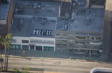 La même année il intervient sur le toit de la galerie d'art de Steve Turner à Los Angeles où il peint un énorme Help Us (aidez-nous) visible uniquement du ciel. Comme un appel de détresse lancé aux étoiles, on repense alors à ses toiles comme le survol de lieux utopiques et imaginaires, lieux-refuges pour accueillir tous les « rayés de la carte ».