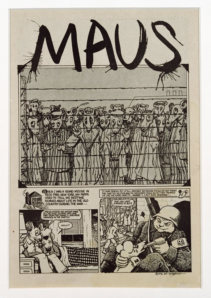 1986 voit la publication de Maus d’Art Spiegelman (Prix Pulitzer 1992), un livre en noir et blanc qui a demandé seize années de labeur à son créateur mais qui part du témoignage lacunaire d’un père, Vladek, survivant de l’holocauste et avec lequel l'auteur s’entend difficilement, pour devenir une fable animalière à double narration entremêlée qui court sur plus de cinquante ans, où les Polonais sont représentés en tant que porcs, les nazis en chats et les Juifs en souris.
