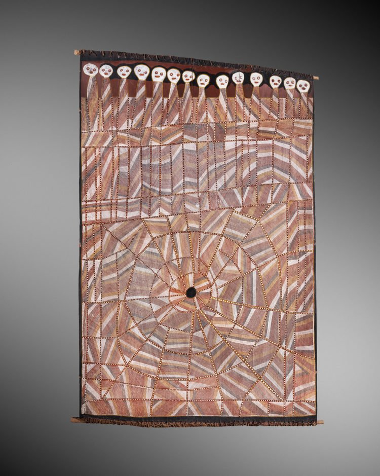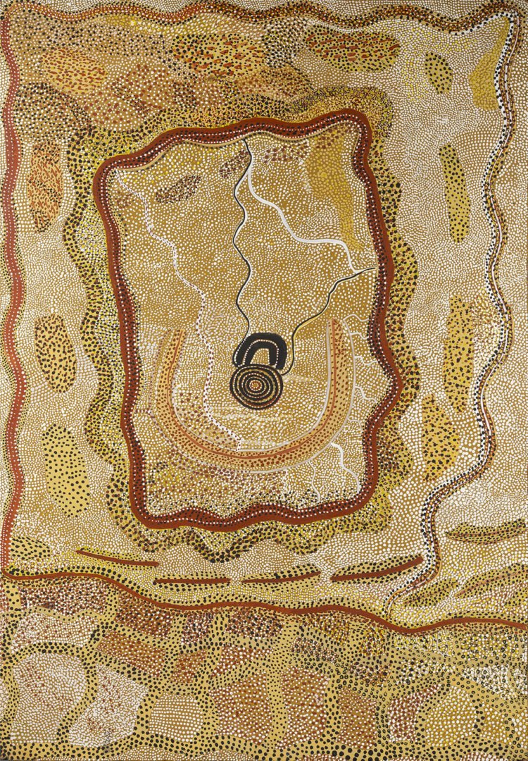 Les Karatgurk et les sept sœurs, le cycle des Tingari, l’affrontement entre les Wati kutjara et l’homme de la lune, le serpent Arc-en-ciel, le lézard à la langue bleue, les mythes fondateurs des aborigènes d’Australie sont innombrables. Certains sont locaux et récents, d’autres sont extrêmement anciens et répandus sous une forme ou l’autre à travers l’ensemble des 900 peuples du continent. Ces histoires ont en commun de se dérouler dans le Temps du Rêve, un temps hors du temps, à la fois passé, présent et futur. Elles ont également comme particularité d’être transmises par le biais de représentations graphiques très codifiées, quasiment abstraites pour des regards non-initiés. Traditionnellement figurées sur des objets, sacrés comme profanes, sous forme de peintures rupestres, sur des supports d’écorces ou bien tracées, temporairement, à même le sable, ces interprétations des histoires tirées de la mythologie aborigènes utilisent plusieurs éléments graphiques minimalistes – traits, points, lignes pointillées – démultipliés à l’infini pour raconter les liens insécables entre les histoires du quotidien et le temps universel du Rêve.