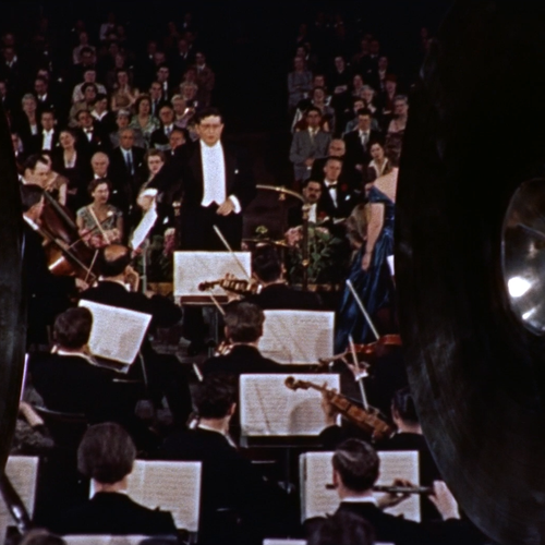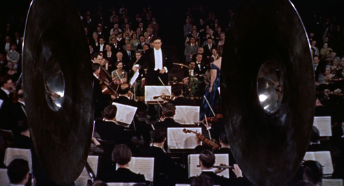 Crédit photo: Alfred Hitchcock, L'Homme qui en savait trop (version de 1956) - Bernard Herrmann chef d'orchestre (à l'arrière-plan), arrêt sur image de la bande-annonce