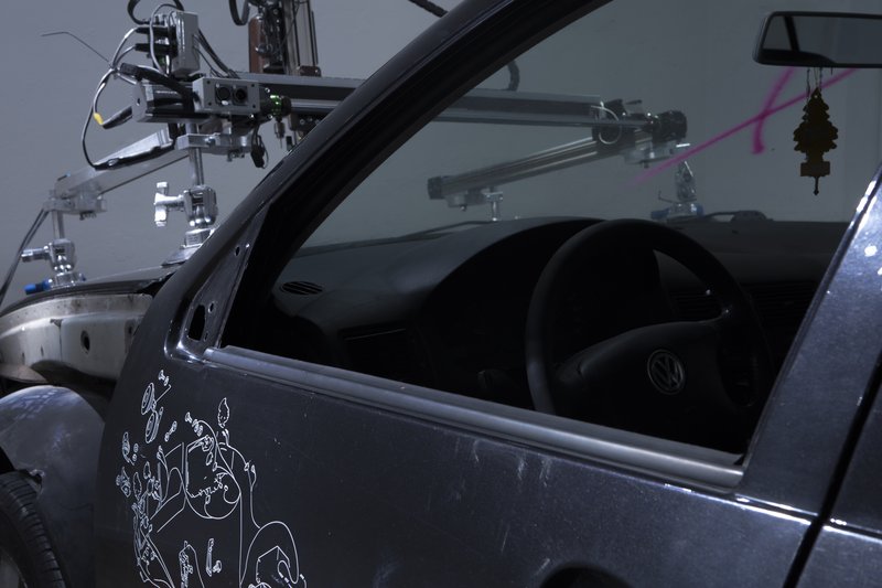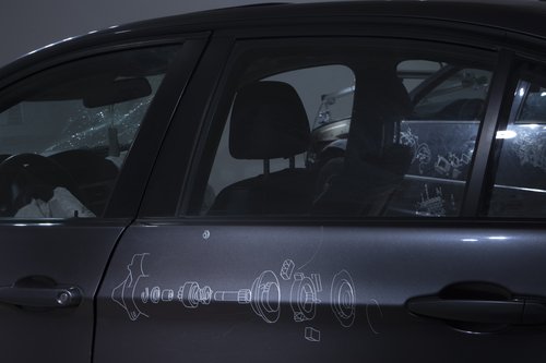 Avec Junkyard et The Material Culture of Mobility, Felix Luque imagine le monde comme un parking abandonné, sorte de charnier pour carcasses automobiles. Il grave, à même les tôles de voitures, des modes d’emploi pour construction de moteur. Une mise en abîme doublement ironique puisque cette gravure est faite au micron près, par un astucieux procédé technique, lui aussi mis en scène. Il en résulte des œuvres qui mêlent l’abandon et le désœuvrement à une forme esthétique particulièrement contemporaine et rutilante. La voiture devenant par ce biais le symbole du monde passé, rendant l’histoire industrielle de l’homme plus marquante que l’Histoire de l’homme elle-même. S’ensuivent des déclinaisons, sorte d’archéologie imaginée : parties de pneu en plâtre reconstituées dans des moules dessinés par scanner, capot de voiture gravé et exposé pareil à un tableau muséal, plan de New York découpé au laser sur de la gomme et exposé indifféremment tel un filet de pêche. Il faut aussi noter l’ironie d’un interminable fil barbelé : un fake découpé, lui aussi au laser, dans un fin aluminium plat et dont les croisements ne sont pas parés de dents de métal enchevêtrées, mais de dessins de carrefours autoroutiers.